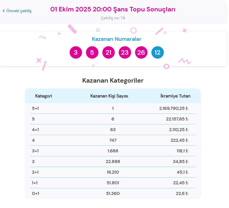 1 Ekim 2025 tarihinde gerçekleşen canlı çekiliş sonucunda 5+1 bilen talihli kişi, 2.169.790,25 TL ikramiye kazandı.