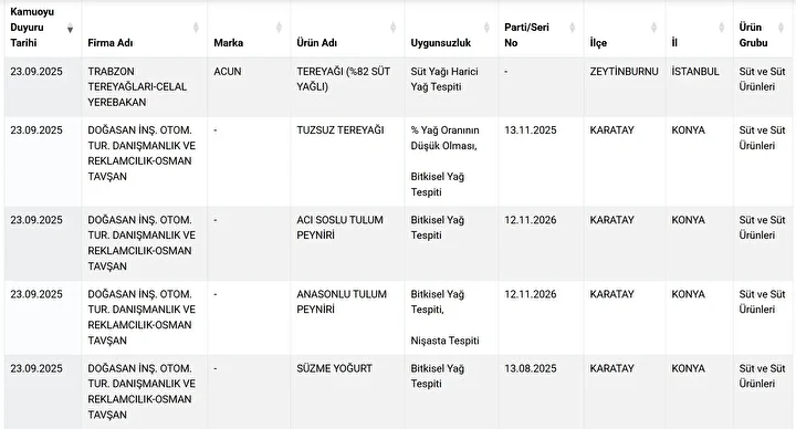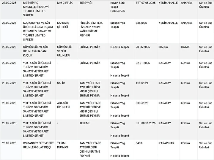 Denizli’de bulunan Kocagöz markasının tam yağlı taze beyaz peynirinde yağ oranının düşük olması Bakanlık tarafından ‘uygunsuz’ bulundu. Kars’ta bulunan Alaaddin Süt Ürünleri tam yağlı taze kaşar peynirinde eritme tuzu kullanıldığı tespit edildi.